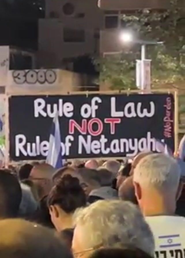 nighttime protest. A crowd of people is visible, many holding Israeli flags. A large banner reads "Rule of Law NOT Rule of Netanyahu". The surrounding environment appears to be an urban area with buildings and streetlights. There is no visible interaction between the people in the crowd. The video seems to be recorded from within the crowd, looking toward the banner. A building with lit windows is in the background.