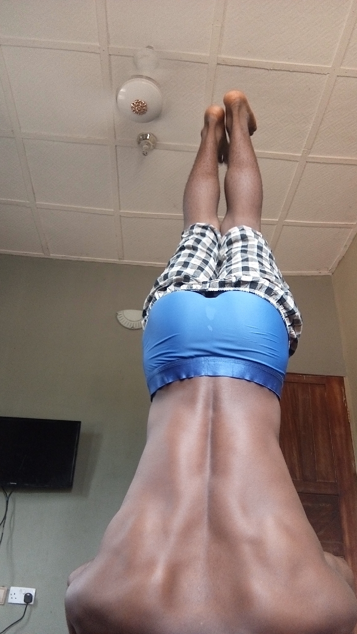 The image depicts an interior scene in Agburu Uke, Nigeria, showing a person in an inverted position, likely a handstand or headstand, viewed from the back. The individual has a dark skin tone, with prominent musculature visible across their back and a defined spinal furrow. They are wearing blue athletic shorts or underwear, which display visible moisture or sweat marks, covered by loose-fitting black and white plaid shorts. Bare legs extend upwards, terminating in bare, pointed feet positioned towards the ceiling. The surrounding environment features a white paneled ceiling with a grid pattern. A white ceiling fan, equipped with a light fixture adorned with a gold decorative element, is visible and appears to be in motion. Below the fan, a smaller, unlit fixture is mounted. The left wall is painted a light olive-green or beige, hosting a wall-mounted flat-screen television, partially obscured by the person. Beneath the television, a white wall-mounted power outlet with multiple sockets is visible, with a black cable plugged in. On the right side of the frame, a wooden door or door frame with vertical paneling is present.