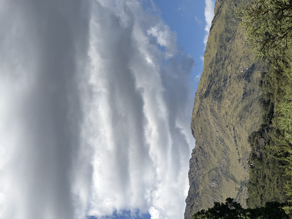 A landscape featuring a lush, grassy mountain partially obscured by leafy trees. Beside the mountain, a sky filled with long, undulating layers of gray clouds dominates the frame, with a glimpse of blue sky visible between the clouds and the mountain. A small utility tower can be seen on the mountain side.