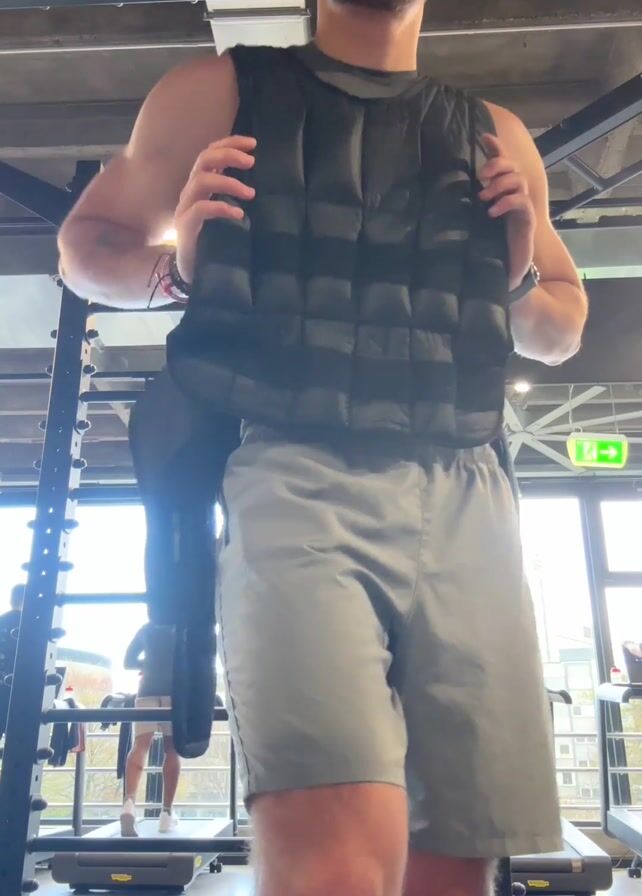 Inside a gym, a young man stands in front of weightlifting equipment. He is fair-skinned, with short, blond-tipped hair. He wears a gray tank top and gray athletic shorts. He takes off a black weighted vest. He looks at the camera and speaks. In the background, a row of treadmills are visible. Another man walks on one of the treadmills.