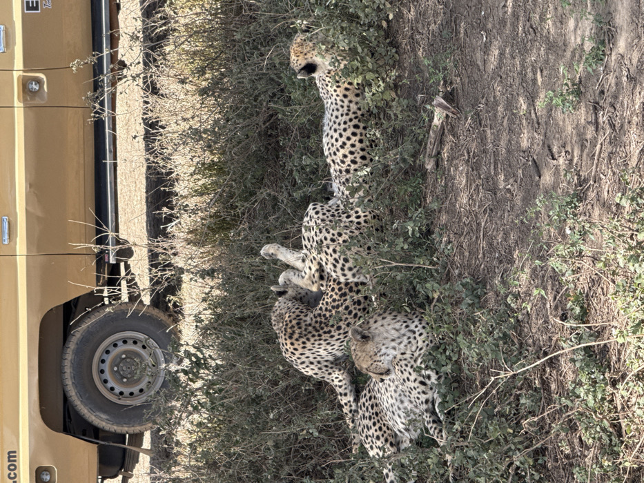 - "This image captures three adult cheetahs resting and interacting in a natural wildlife environment within Unknown, Tanzania, under bright daylight" by FM-ohOUo2, licensed under CC BY 4.0