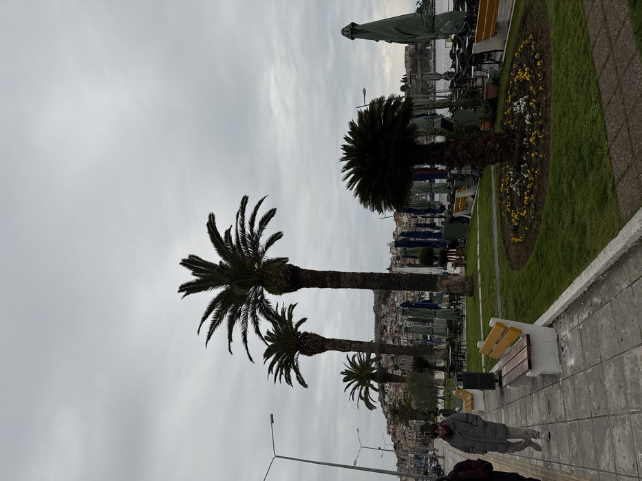 The image depicts a coastal urban scene in Kavala, Greece, likely along the harborfront. The sky is overcast, with a uniform light grey cloud cover. In the foreground, a paved pedestrian walkway is visible, composed of light grey and brown square tiles. A white concrete curb separates the walkway from a strip of green lawn. Two individuals are present on the walkway; one person, wearing a dark jacket, is partially visible on the far left. To their right, a second person walks rightward, away from the camera, wearing a light grey puffer jacket, light trousers, and light-colored shoes. A dark cylindrical trash receptacle is positioned near a public bench on the walkway. The bench features a concrete frame with wooden slats and a yellow-painted backrest and armrests. The grassy strip contains several palm trees of varying heights. Three tall, slender palm trees with dark green fronds stand prominently. Closer to the foreground, a shorter, bushier palm tree is situated within a circular flower bed containing small yellow and white flowers. Further along the grassy area, more benches with yellow accents are visible. To the right of the grassy area, a commercial zone features numerous outdoor tables and chairs, with a multitude of large, folded patio umbrellas, predominantly dark green or blue, suggesting a cafe or restaurant area adjacent to the water. In the background, a body of water is visible, extending towards a hilly landmass. The hills are densely populated with multi-story buildings, characteristic of a city. At the summit of the central hill, a fortified wall, likely part of Kavala Castle, is clearly discernible. Multiple street light poles with dark arms extend from the left side of the frame.