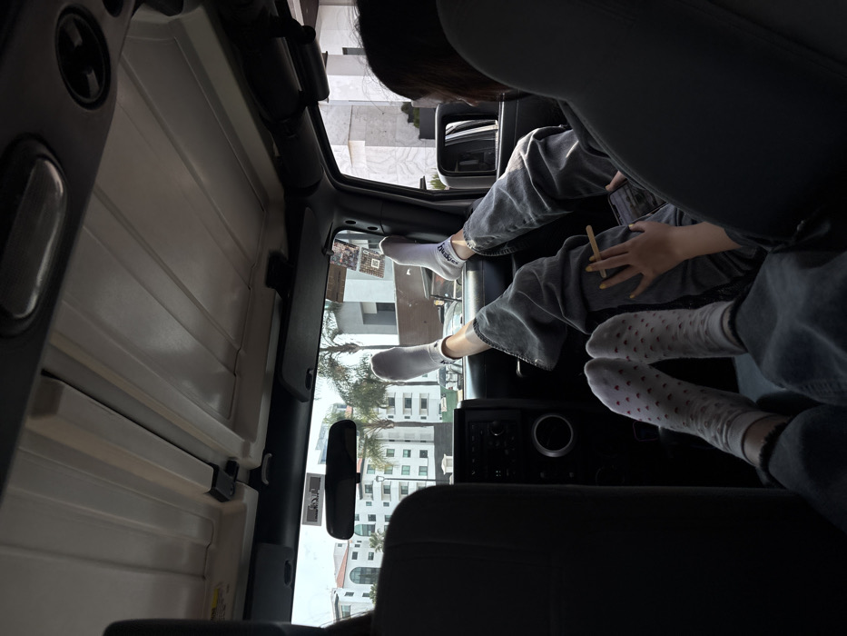 The image depicts the interior of a vehicle, looking forward through the windshield. Two individuals are present, observed primarily by their legs and lower bodies. In the foreground, a person is seated, with their legs extended forward, wearing light gray socks adorned with small red heart patterns and dark pants. This individual's right hand, with yellow painted nails, holds a dark-colored smartphone and a light-colored, slender stick-like object. Further forward, another individual has their legs extended and resting on the dashboard, wearing light gray socks, one displaying a "Dickies" logo, and loose-fitting dark gray jeans. The upper part of this individual's head, showing dark hair, is visible on the right. The vehicle interior features a dark dashboard with a visible radio or control panel to the left, and a light-colored hardtop roof above. A rearview mirror is centrally located. The external environment, seen through the windshield, suggests a daytime urban or suburban setting in San Bernardino Tlaxcalancingo, Mexico. Multiple multi-story buildings are visible; some feature white facades with arched windows and doorways, while others display modern gray stone or concrete finishes. Several palm trees and other greenery are scattered throughout the background, indicative of a warm climate. A street or thoroughfare is visible in the distance.