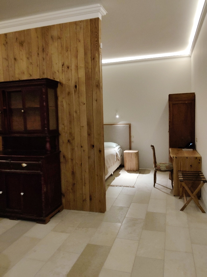 This image captures the interior of a room in Skorniakovo, Russia. The space features a light-tiled floor and light-colored walls, with white crown molding and perimeter strip lighting along the ceiling. A vertical partition wall, constructed from light-toned wooden planks, divides the room. In the left foreground, against the wooden partition, stands a dark reddish-brown wooden hutch. This hutch has an upper section with glass-paned doors and a lower section containing two drawers and two solid cabinet doors, all equipped with light-colored pull knobs. Beyond the partition, a bedroom area is visible. A bed with a light-colored upholstered headboard and white linens is positioned against the far wall. To the right of the bed, a rustic, light-toned wooden block serves as a nightstand. A small, light-colored rug is placed on the floor beside the bed, and a small, spherical light fixture is mounted on the wall above the bed. To the right of the bed, a light-toned wooden desk, also constructed from planks, is situated against the far wall. A wooden chair with a patterned fabric seat cushion is placed at the desk, which holds a dark electronic device. Above the desk, a tall, narrow, dark wooden wardrobe or cabinet is mounted. A foldable wooden luggage rack with dark straps is present in the lower right foreground. No individuals are present in the scene.