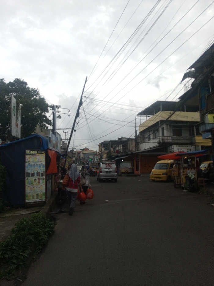 The image depicts a street scene in Sindanglaya, Indonesia, under an overcast sky