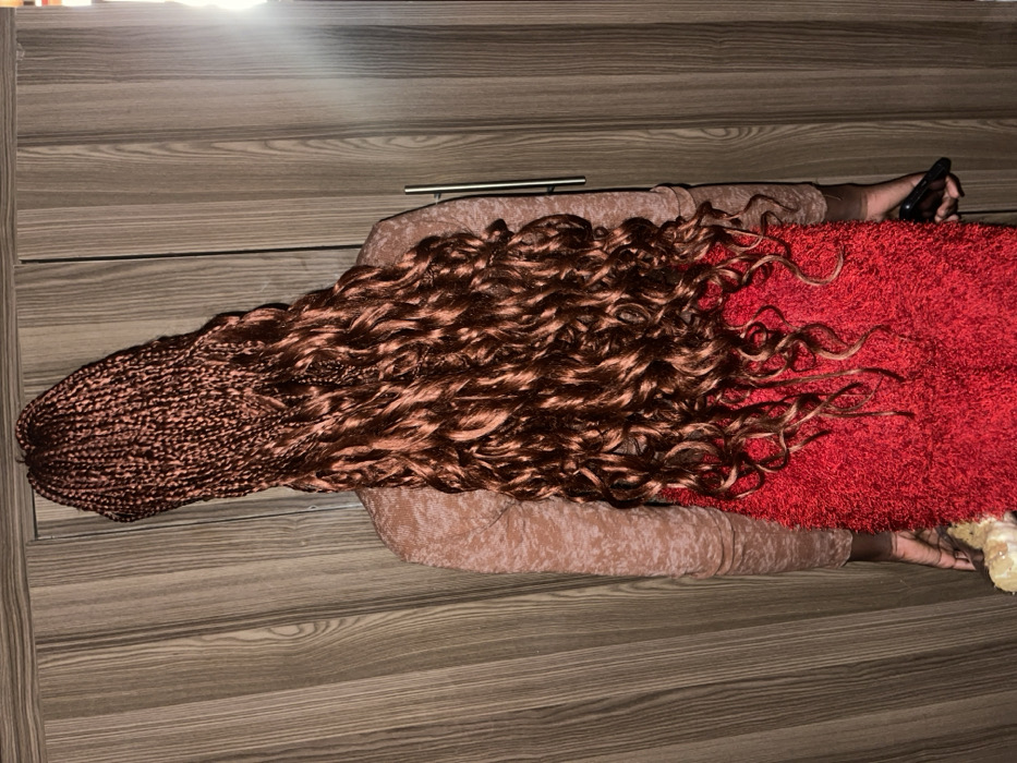 The image displays an individual, viewed from behind, in what appears to be an indoor setting in Unguwar Gabas, Nigeria. The individual exhibits long, reddish-brown hair styled in micro braids from the scalp, transitioning into voluminous, tightly curled strands that extend down the back to approximately waist level. They are dressed in a light brown, long-sleeved, textured top and a prominent, vibrant red, shaggy or fluffy lower garment, possibly a skirt. In the lower left, the individual's left hand is visible, holding a light-colored object, consistent with a piece of cake or pastry topped with white frosting. In the lower right, their right hand holds a dark-colored smartphone. The background consists of a light to medium brown wooden cabinet or wardrobe, featuring two vertical panels with visible wood grain and a metallic vertical handle on the right panel.