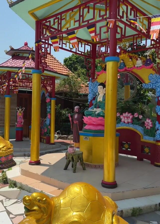 Buddhist temple courtyard with two golden turtle statues in the foreground. The courtyard contains small pavilions that feature colorful statues of Buddha and other religious figures. The pavilions are decorated with Buddhist flags and colorful carvings of flowers and clouds. A set of stairs leads up a hill in the background.