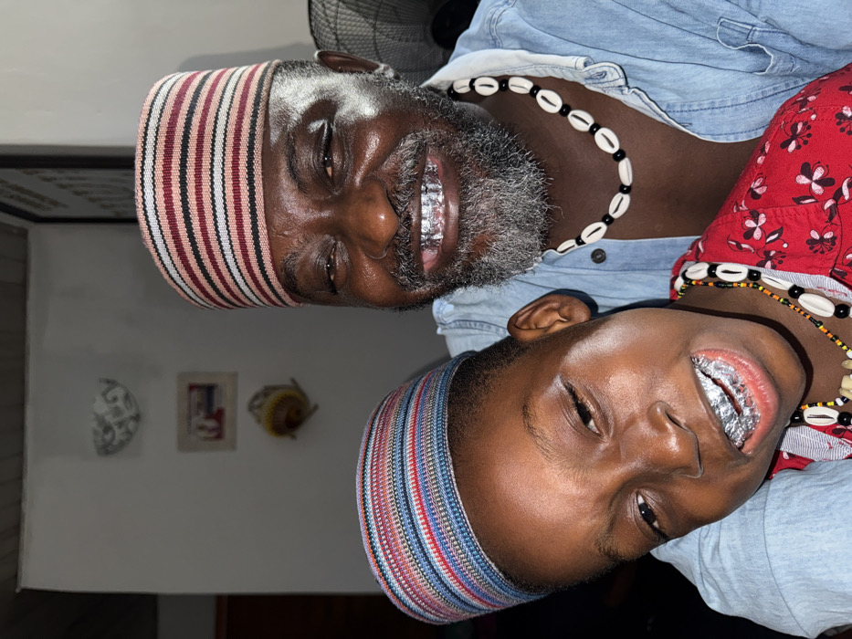 In an indoor setting in Ado, Nigeria, an adult male and a younger male pose together, both smiling broadly. The adult male, positioned to the right, has dark skin, a grey beard, and wears a multi-striped cap (red, white, black). He is dressed in a light blue denim-like shirt and a necklace featuring black beads and white cowrie shells. His upper and lower teeth are covered with silver-colored dental grillz. The younger male, situated slightly to the left and in front of the adult, has dark skin and wears a similarly striped cap (blue, white, red, black, light blue, orange), a red shirt with a white patterned design, and two layered necklaces consisting of colorful beads and black beads with white cowrie shells. He also displays silver-colored dental grillz on his upper and lower teeth. The adult's left arm is visible around the younger male. The background features a light-colored wall adorned with a patterned half-bowl, a small framed picture, and a woven decorative item. A dark object, consistent with a fan, is partially visible on the far right.