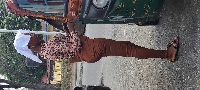 A female individual stands on a paved road in Aba, Nigeria, positioned to the left of a multi-colored green and orange commercial tricycle, commonly known as a Keke Napep