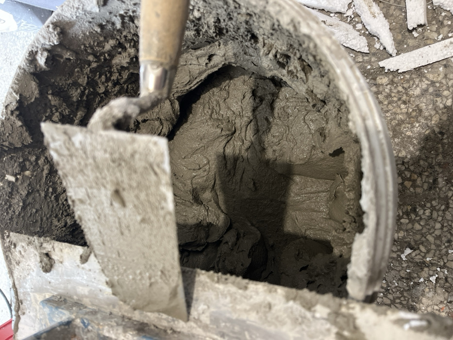The scene depicts a close-up, overhead view of a construction bucket containing a grey, viscous cementitious mixture