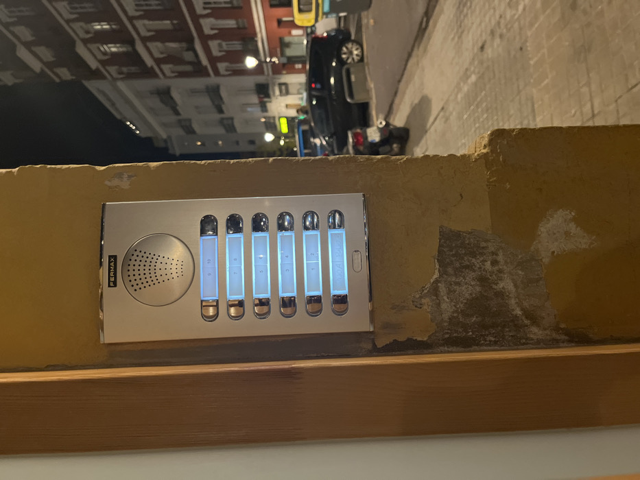 An outdoor intercom system with a speaker and six numbered buttons is mounted on a stucco wall