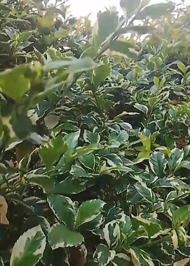 field of green and white leafy bushes, with a bright sunrise visible in the background. The camera is positioned low, looking up through the bushes towards the sky. The sky is partly cloudy with a pinkish hue from the rising sun. The camera slowly pans upward, revealing more of the sky and the tops of the bushes. The sun peeks through the branches of the bushes.