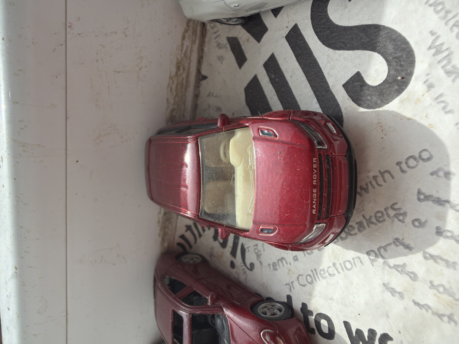 The scene displays three dusty metallic toy cars, set within the city of Kermen, Bulgaria. In the foreground, a prominent red metallic Range Rover Evoque model faces forward and slightly right, exhibiting significant dust accumulation on its exterior and a scuffed windshield. Its light-colored interior is visible. To its left, a partial view of a second red metallic toy sports car, resembling a coupe with a sunroof, is present, also showing dust and a silver multi-spoke wheel. To the far right, only the front-right portion of a third, silver or light-grey metallic toy car is visible. The vehicles rest on a flat, light-colored surface featuring black printed text and graphic patterns, including discernible fragments like "r Collection pr" and "speakers with too." The surface and an off-white vertical background behind the cars are notably grimy and covered with dust and debris. Bright overhead lighting casts clear shadows from the objects onto the patterned surface.