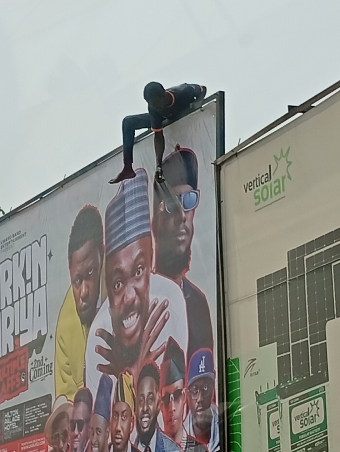 In Kofar Mazugal, Nigeria, an outdoor scene captures a dark-skinned male positioned precariously atop a large billboard against an overcast gray sky