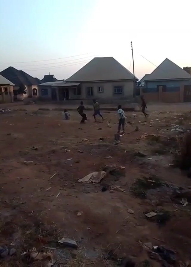 group of about five children playing soccer in a dirt field in what appears to be a residential area. The field is bare except for scattered pieces of trash and debris. Houses with light-colored walls and dark roofs surround the field. A utility pole is visible in the distance. The sky is a pale blue, suggesting it is either early morning or late afternoon. The children are dressed in casual clothes, and their movements indicate they are actively engaged in a game of soccer. One child falls to the ground during play.
