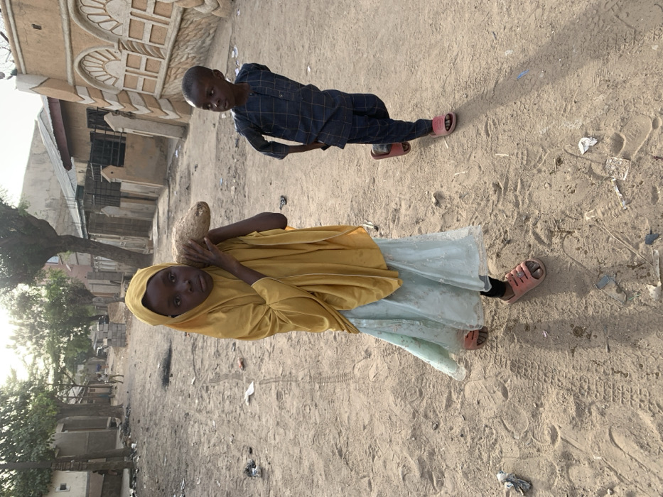A young girl and boy are captured walking on a dusty, unpaved road in the city of Gawuna, Nigeria