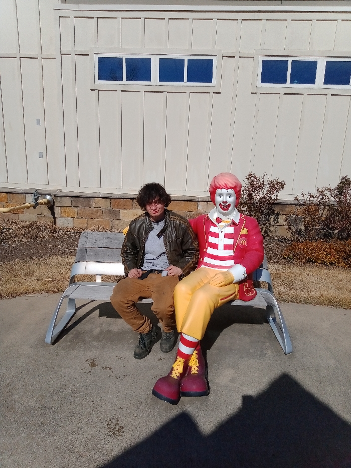 - "A person with dark hair and a brown jacket sits on a gray bench next to a Ronald McDonald statue" by FM-ZMhiq2, licensed under CC BY 4.0