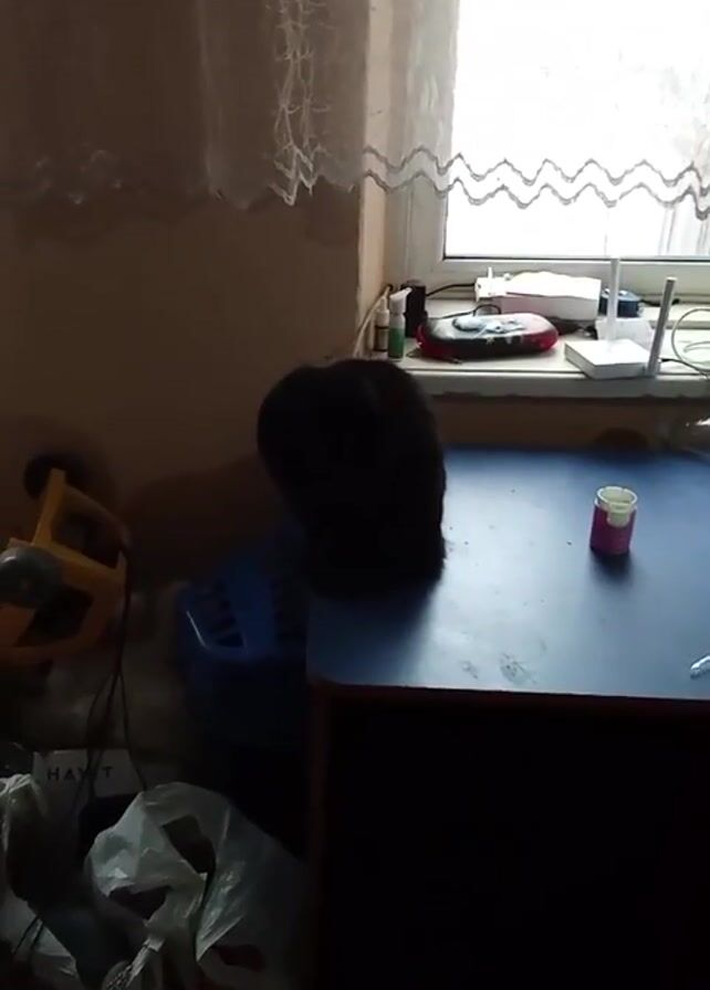 black cat sitting on a blue desk in a room with a window. The room is dimly lit. Various objects are scattered around the desk and floor, including a blue plastic basket, a toy, and a container on the desk. The camera zooms in on the cat's face.