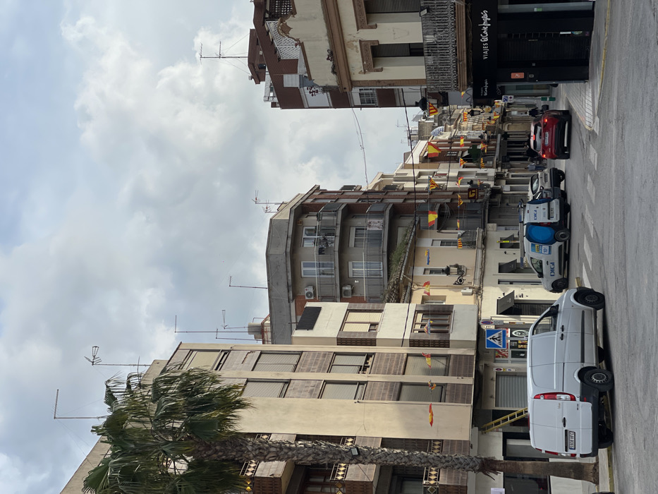 The image depicts a street scene in Paiporta, Spain, under an overcast sky. The view looks down a curving street lined with multi-story buildings of varying architectural styles, predominantly in shades of cream, brown, and grey. A prominent palm tree stands on the left side of the frame, partially obscuring the facade of a building featuring multiple windows with closed shutters and decorative balconies. Along the street, numerous small red and yellow flags are strung overhead between buildings. A white panel van, license plate "3008 HFC," is parked on the left, facing away from the viewer. Behind it, a blue and white service van with "DIGI" branding is also parked, followed by a dark grey sedan. Further down the street, a red SUV with illuminated brake lights is turning right. A crosswalk is visible on the asphalt in the foreground. Several indistinct human figures are visible on the sidewalks in the middle ground and background. A yellow ladder leans against a building on the left. On the right, a dark shopfront with the signage "VIAJES El Corte Inglés" is visible. Rooftops of the buildings are equipped with various television antennas. Overhead power lines crisscross the sky between buildings.