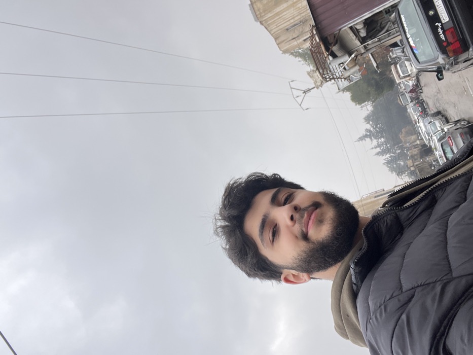The image presents a street scene in At-Tall, Syria, under an overcast sky. In the immediate foreground, a young adult male with dark hair and a full beard, dressed in a black puffer jacket over a green hoodie, is depicted in a selfie format, looking towards the camera with a slight smile. The background reveals a wet, asphalt street populated by a line of parked and slow-moving vehicles, including various sedans and a distant truck. A black sedan on the right exhibits "M Power" branding and Arabic text on its rear bumper. Overhead power lines traverse the sky, supported by a metal utility tower visible on the right side of the frame. Buildings with weathered facades flank the street, and trees are discernible in the distance behind the structures and vehicles.
