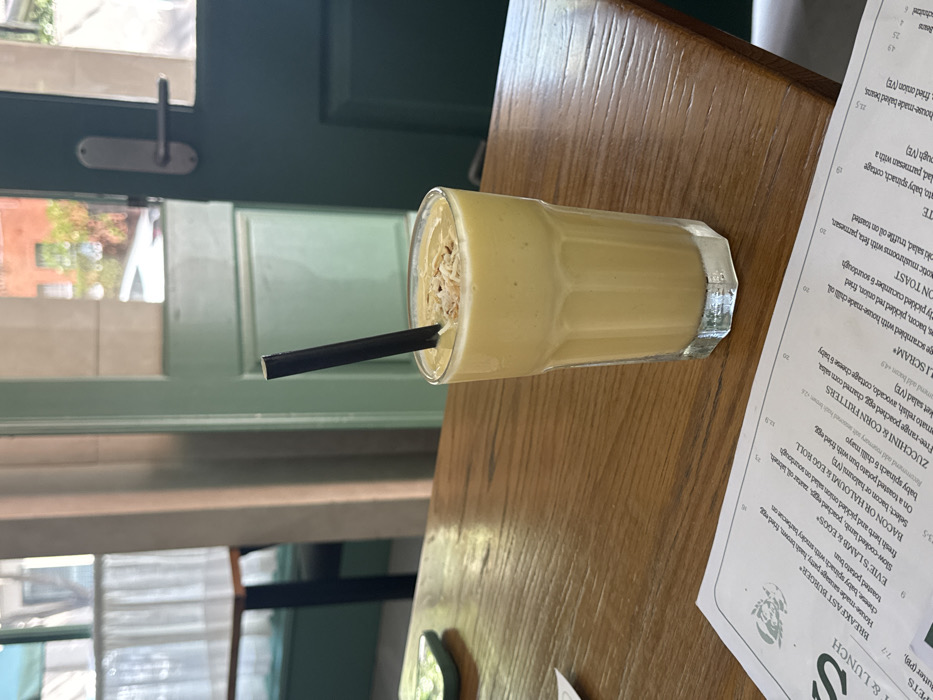 On a wooden table, a glass of yellow smoothie with a black straw sits next to a menu