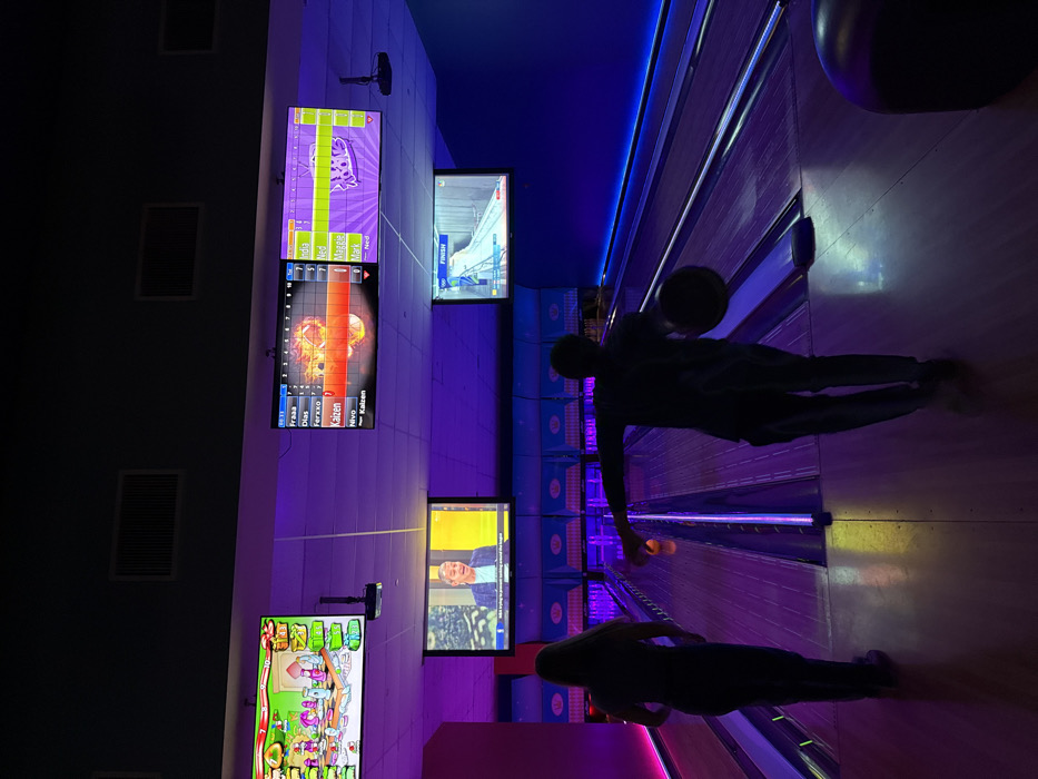 A bowling alley is illuminated by violet and blue lights. Four screens displaying bowling scores and other entertainment are mounted on the wall. Two individuals are present; one is mid-throw with a bowling ball raised, while the other appears to be observing, with both figures silhouetted against the lane. The lane itself reflects the ambient light, adding to the overall colorful and active atmosphere.