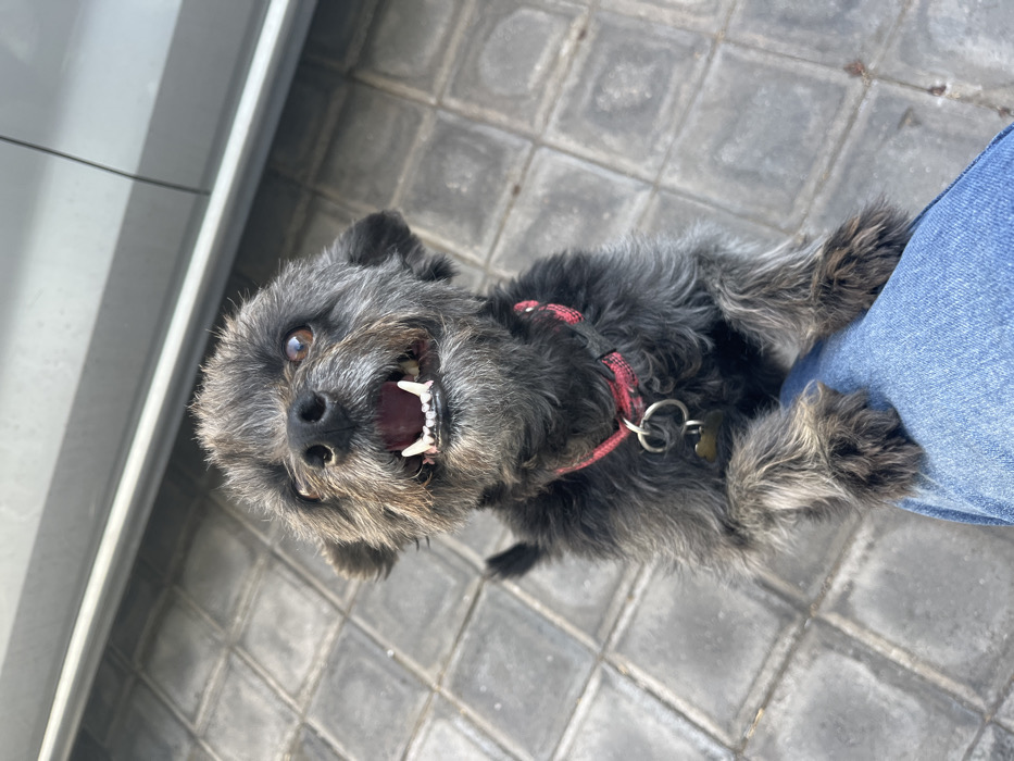 - "A small, gray, scruffy dog with wiry fur and a pink collar is looking up at the camera, its mouth open, revealing its teeth" by FM-c5Nd33, licensed under CC BY 4.0
