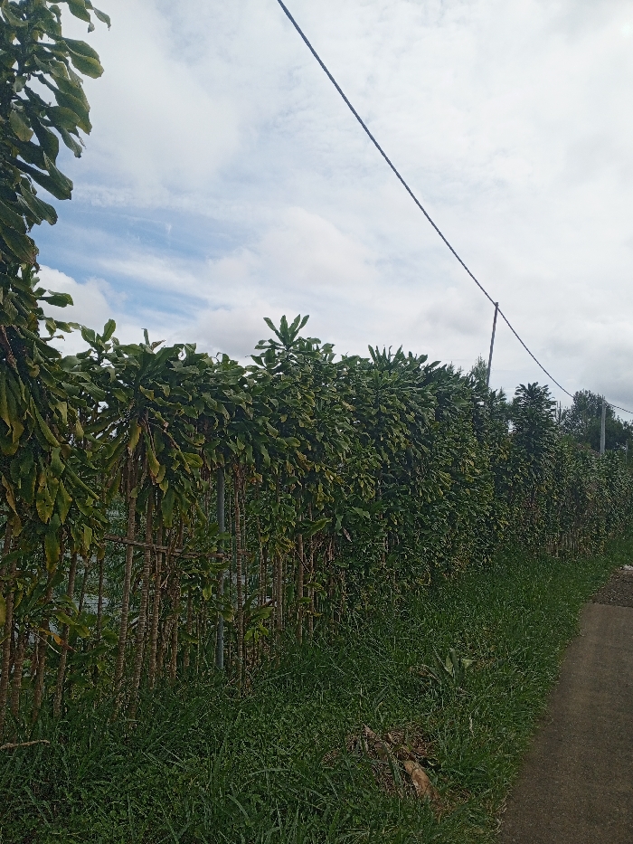 A lush green hedge lines a pathway beneath a cloudy sky. The hedge is dense, with closely planted trees featuring long, broad leaves. Tall stalks rise from the ground, supporting the leafy canopy. Overhanging the scene is a power line, stretching diagonally across the frame. Grass grows thick along the base of the hedge and beside the paved path, creating a natural, slightly overgrown look.