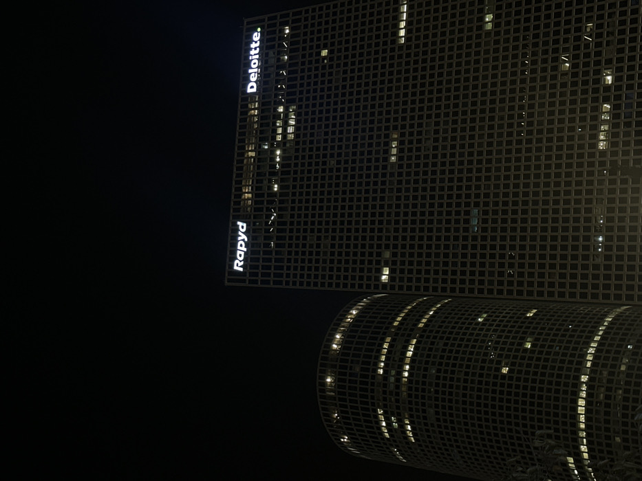 A nighttime view showcases two buildings, one squared and the other cylindrical, both featuring a grid-like facade with illuminated windows. The squared building vertically displays the words "Deloitte." and "Rapyd." on its edge. The lower left portion of the image is black, contrasting with the lit-up architecture against the dark sky.