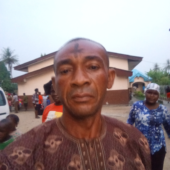 A selfie features a bald man with a dark mark on his forehead, possibly ash. He wears a patterned brown shirt. Behind him, a crowd of people stands near a cream-colored building with brown trim. To his right, a woman in a blue floral top and headscarf is partially visible. A white van is on the left. The sky is overcast, suggesting it may be early morning or late afternoon.