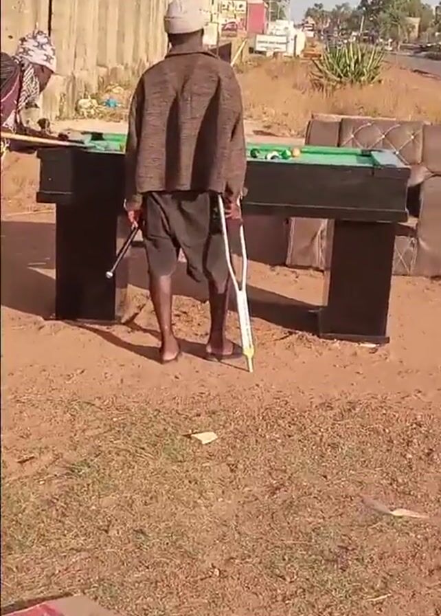 The scene shows two men outdoors by a pool table. One man is wearing a brown poncho, shorts, a skullcap, and sandals. He is holding crutches and a pool cue. The other man is wearing a jersey, patterned shawl, and white pants. He is holding a pool cue and watching the first man. The pool table is black with a green felt surface. The environment is a dry, dusty area with buildings in the background. A vehicle is visible on a road in the distance. The man with the crutches appears to be preparing to take a shot at the pool table.