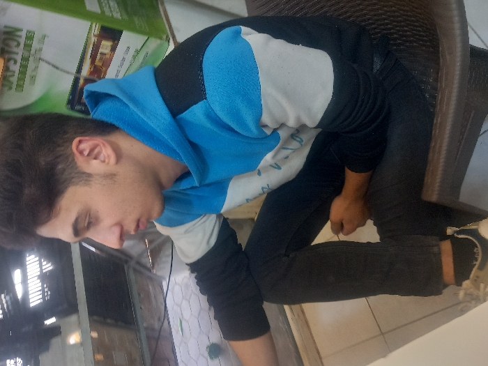 - "A young male individual, appearing to be in his late teens or early twenties, is seated indoors in profile, facing right, in the city of Munin, Syria" by FM-f9Cwn2, licensed under CC BY 4.0