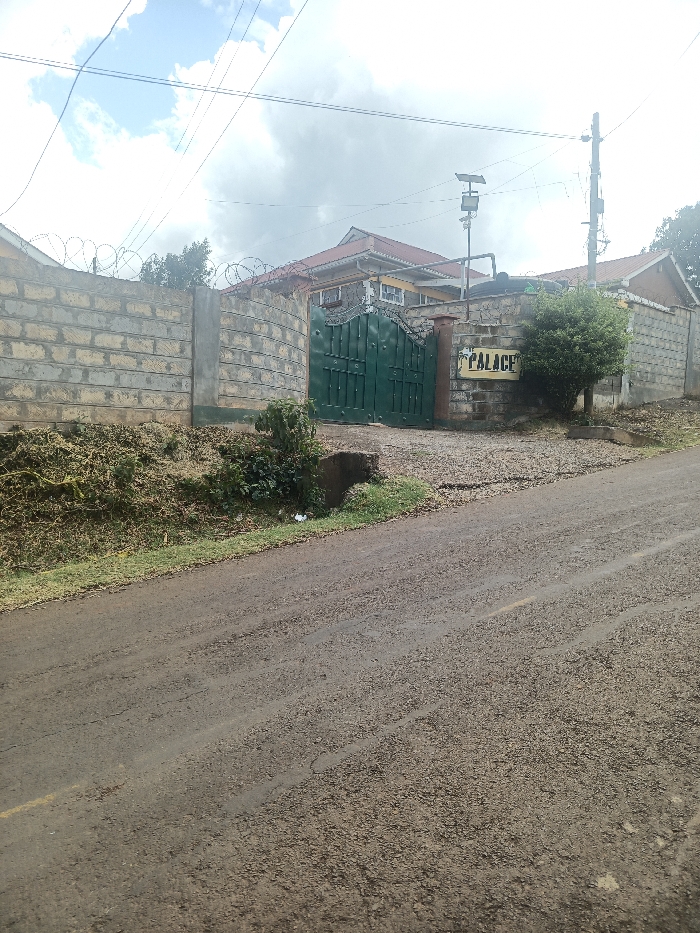A paved road dominates the foreground. Vegetation borders the road's edge, leading to a walled property with a green gate and a sign reading "The Palace." The wall is constructed of grey concrete blocks topped with barbed wire. Behind the wall, a multi-story house with a red-tiled roof is visible. Utility poles and wires stretch across the sky, which is filled with scattered clouds.