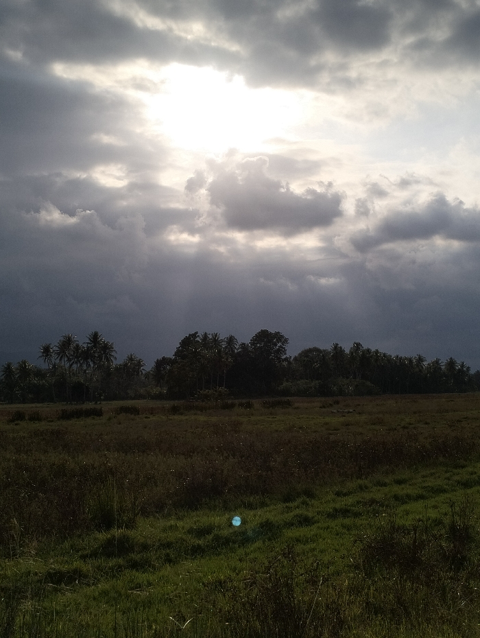 The image depicts an expansive outdoor landscape in Jambo Dalam, Indonesia. The upper half of the frame features a heavily clouded sky, composed primarily of dark gray and white cumulus formations. A prominent, intense white light source, presumed to be the sun, is visible in the upper-center, partially obscured by clouds, with visible light rays extending downwards. The lower half of the frame presents an open field. The immediate foreground consists of vibrant green grass, transitioning into a vast area of denser, browner, and drier vegetation in the midground. Forming the distant horizon, a dense line of numerous dark green palm trees, consistent with coconut palms, and other foliage stands against the lighter sky. No individuals, animals, or man-made structures are present within the scene. A circular, semi-transparent bluish-green light artifact is visible in the lower-central portion of the field.