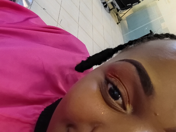A close-up image focuses on a person's face. One eye, made up with red and gold shadow, is prominent. A neatly defined eyebrow sits above it. Part of the person's hair, styled in braids, is visible at the top. A bright pink material drapes over the person's shoulder. In the background, there's a tiled floor and blurred shapes of a chair. The overall composition is slightly angled.