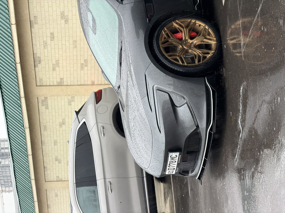 The image depicts an outdoor urban scene in Tashkent, Uzbekistan, under rainy conditions. Two vehicles are parked on a wet, reflective asphalt surface, indicating recent or ongoing precipitation. In the foreground, a dark gray electric sedan, identified as a Nio ET7 by its distinctive front fascia with integrated angular LED headlights and a minimalist grille-less design, is prominently featured. The vehicle displays a white Uzbek license plate, "01 D 778 MC," on its front bumper, confirming its registration in Tashkent (code "01"). It is equipped with multi-spoke, gold-colored aftermarket wheels, behind which prominent red brake calipers are visible on the front right wheel. A black front splitter is mounted below the bumper. Numerous raindrops are visible on the vehicle's body and windshield. In the mid-ground, partially obscured by the foreground vehicle, a light gray or silver SUV, likely a Lincoln Corsair or similar model, is parked. Its rear passenger side and part of the taillight are visible, also appearing wet from the rain. The background consists of a light beige or tan brick-patterned wall with vertical pilasters, topped by a dark green corrugated metal roof structure. In the far upper left, faint outlines of modern high-rise buildings or construction cranes are discernible against an overcast sky. No people are visible in the scene.