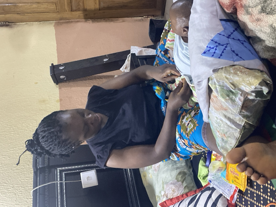 - "A woman wearing a black t-shirt is sitting on a bed, holding a baby wrapped in colorful fabrics" by FM-v68Gl1, licensed under CC BY 4.0