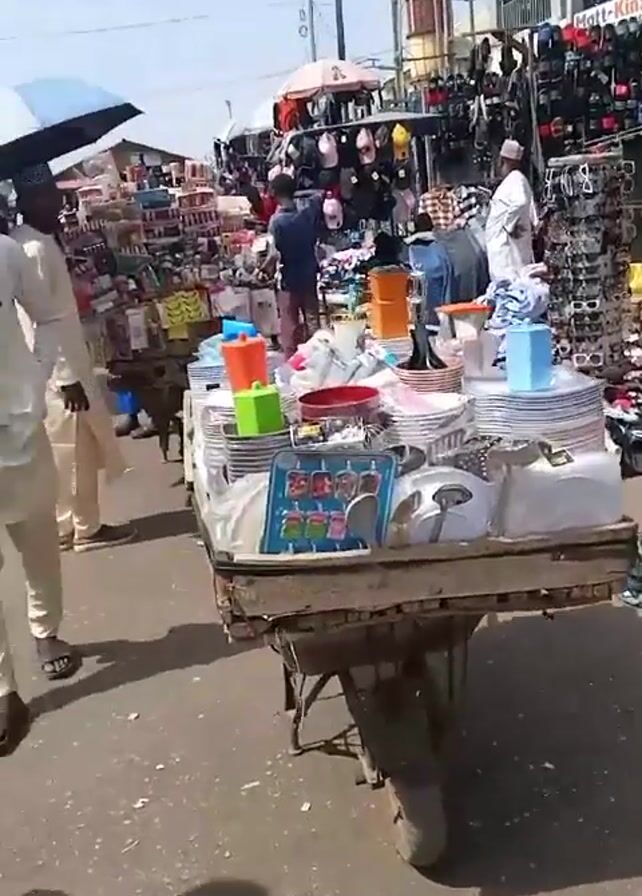 bustling outdoor market scene. Many vendors are displaying their wares on carts and tables. A cart in the foreground is loaded with stacks of plates, bowls, and other kitchenware. Other carts display a variety of goods, including hats, sunglasses, and cosmetics. People are seen walking through the market, some stopping to browse the merchandise. The market appears to be located in a busy urban area, with buildings visible in the background. Overall, the video captures the lively and vibrant atmosphere of a typical marketplace.