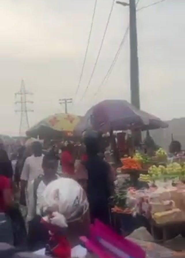 busy outdoor market. Numerous people walk through the market, looking at goods displayed on tables and under umbrellas. The tables appear to hold fruits and vegetables. An electrical pole and power lines are visible overhead. The sky is overcast.