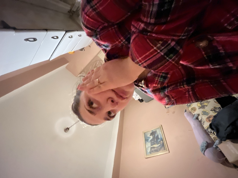 A person in a red plaid shirt looks at the camera with their hand covering one eye. Behind them, a white ceiling with a light fixture transitions to a peach-colored wall with a framed picture. A set of white cabinets is visible at the top of the frame, while part of a bed and objects are seen in the lower right corner. The photo appears to be taken from a low angle, giving a downward perspective.