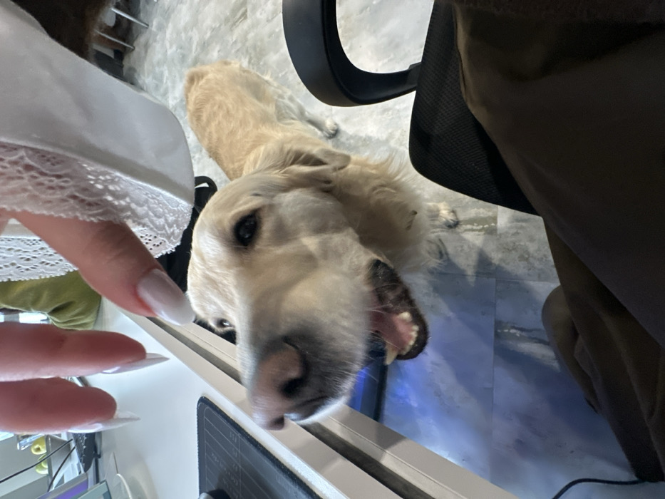 A golden retriever lies beneath a desk, its nose nearly touching the surface. A hand with long, white nails reaches towards the dog. The dog's mouth is slightly open, revealing its teeth. A black office chair and a person's leg are partially visible on the right side. The floor is gray and patterned. A small section of a green object is visible to the left of the hand.