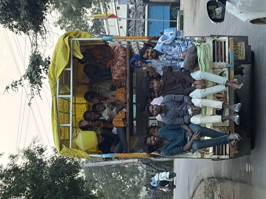 A light commercial vehicle, identified by the license plate "KA39B 2775," transports a substantial group of individuals on a road in Chikkarampur, India