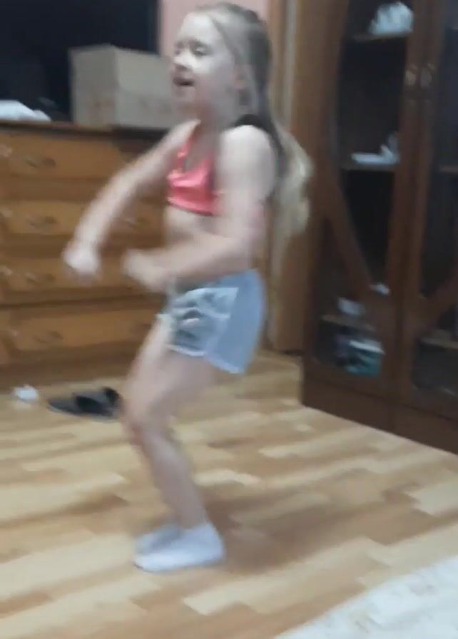 young girl, approximately 5-7 years old, with blonde hair in a ponytail, wearing a pink sports bra with black trim and gray shorts with white trim and white socks, dancing in a room. The room has light-colored wood flooring. Behind her, there is a wooden dresser with drawers and a television on top, and a dark wood cabinet. She is jumping, raising her arms, and swaying her body to the music. There are also items on the floor, including a pair of flip-flops, a pillow, and a piece of paper.
