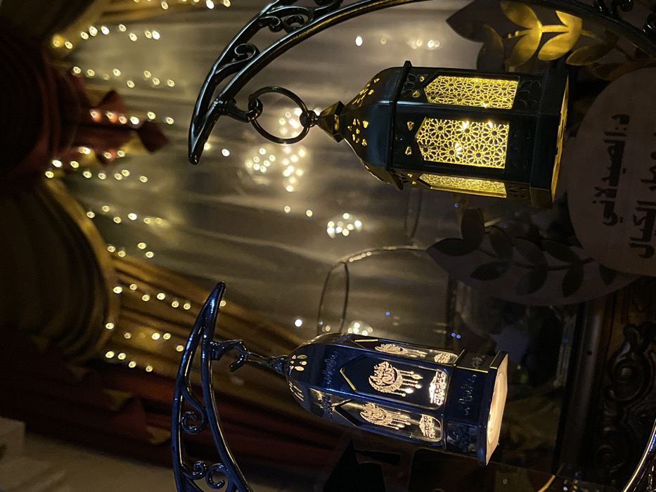 The image displays two illuminated metallic decorative lanterns in an indoor setting within Sarouja Municipality, Syria