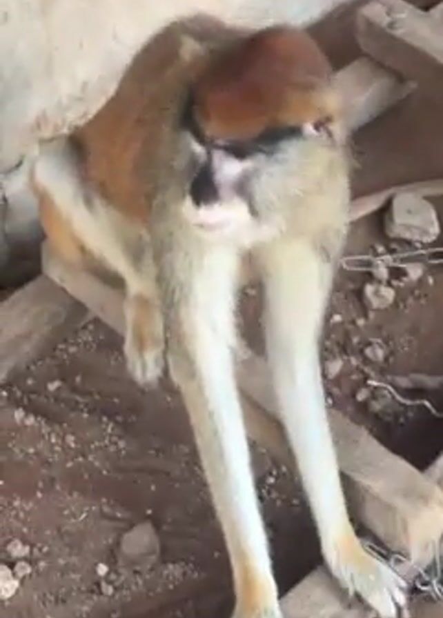 A monkey is the focus of a short video. The monkey is seated on a pile of wooden planks, its body oriented towards the camera. The monkey has brown fur around its head and shoulders, with lighter, almost white fur on its belly and legs. The monkey's face features black markings around the eyes and nose, giving it a distinct appearance. The monkey is indoors, the background consisting of a wall, the ground covered with dirt and debris, and a chain partially visible on the ground. The camera is static and records the monkey without any additional action taking place.