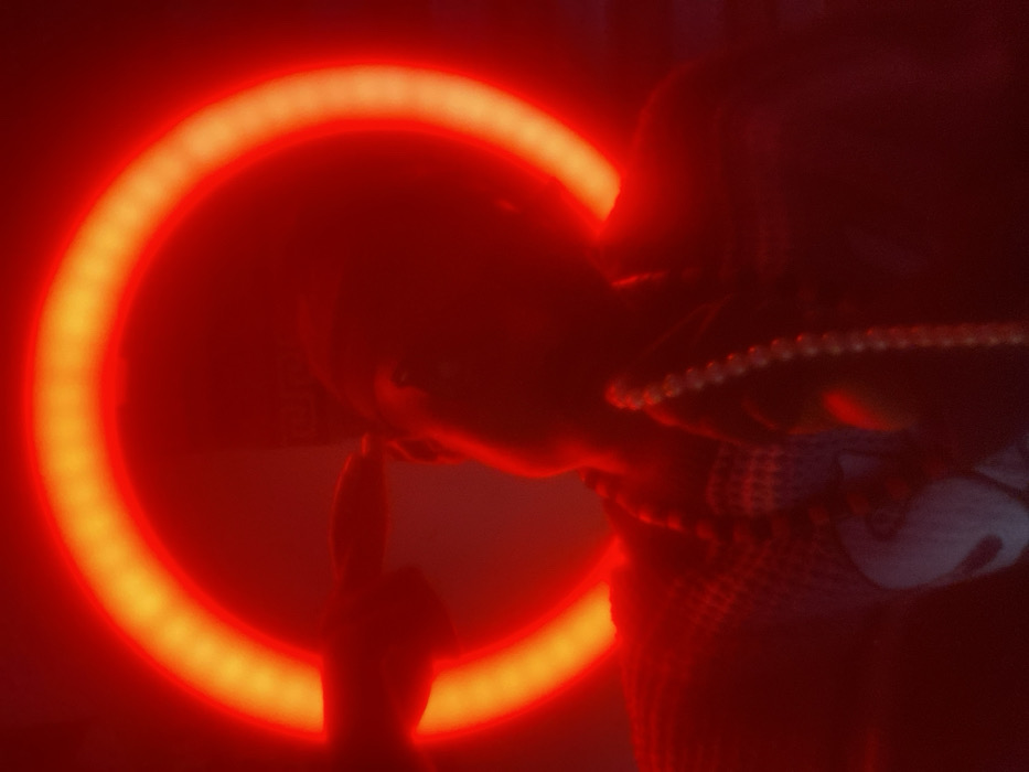 A figure stands illuminated in red light, partially obscured. A bright, circular light frames the left side of the image. The figure appears to be leaning forward, with a finger raised in front of their face. They wear what seems to be a patterned garment and a string of pearls. The overall impression is mysterious and dreamlike, due to the deep red hue and partial obscuring of the subject.
