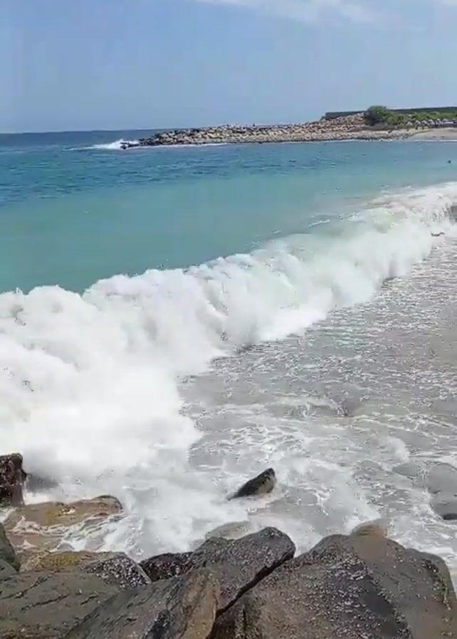view of a beach on a sunny day. In the foreground, there are large, dark rocks. The waves are crashing against the rocks, creating white foam. The water is a light turquoise color. In the background, there is a beach with people swimming, sunbathing, and walking. There are many colorful umbrellas on the beach. Further back, there are buildings that appear to be hotels or apartments. In the right part of the frame, a hand holding a drink in a blue plastic cup is visible. The overall impression is of a lively and popular beach scene.