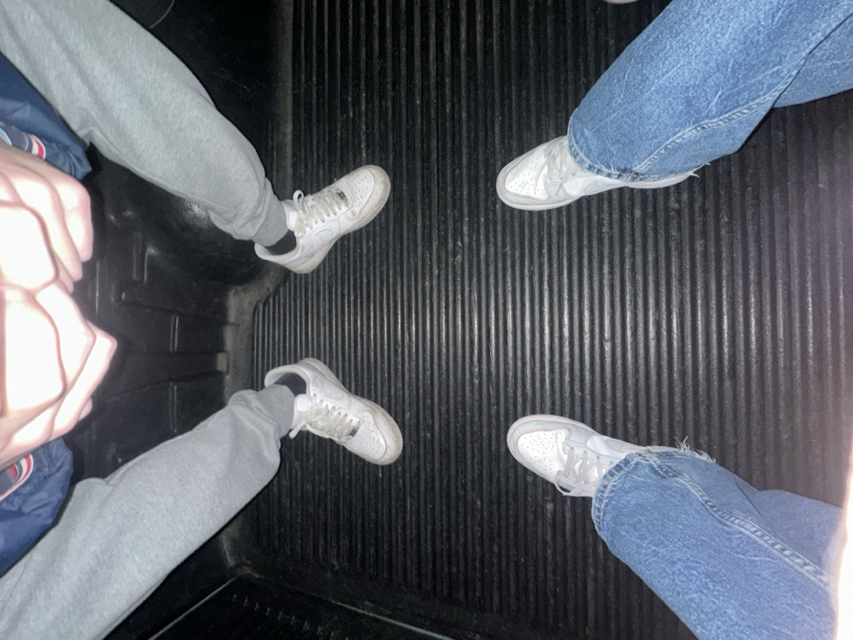 The image depicts the lower bodies and feet of three individuals within what appears to be the cargo bed of a vehicle, characterized by a ribbed, black, anti-slip surface. Two individuals are positioned towards the top of the frame, wearing grey sweatpants and white Nike Air Force 1 sneakers. Their clasped hands are visible at the very top, suggesting they are seated or kneeling. The third individual is positioned towards the bottom of the frame, wearing blue jeans and white Nike Dunk sneakers. This individual appears to be the photographer, holding a device pointed downwards. All visible subjects are wearing white athletic footwear, displaying minor scuff marks and dirt consistent with use. The lighting is dim. The specific location within the city of Mirandela, Portugal, cannot be determined from the visual information provided.