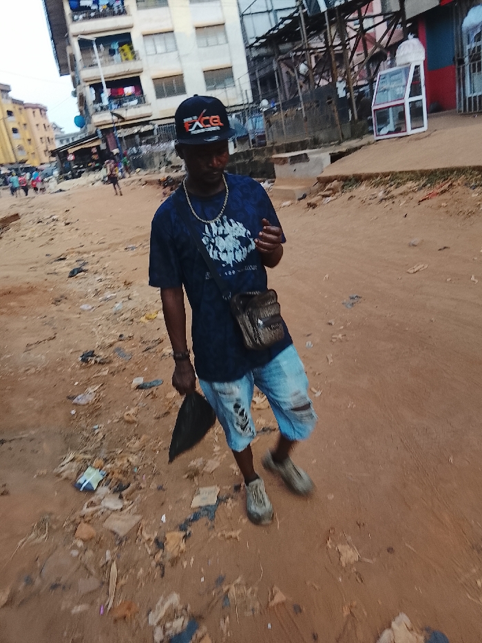 This image captures a daytime street scene in Onitsha, Nigeria. The central subject is a dark-complexioned male, positioned slightly right of center, walking towards the viewer's left. He wears a black baseball cap with "EXCEL" lettering, a dark blue short-sleeved t-shirt featuring a light-colored graphic design, a gold-toned chain necklace, and a dark brown crossbody bag slung over his right shoulder. His lower body is clad in light blue, heavily distressed denim shorts and light-colored sneakers, which exhibit motion blur consistent with movement. In his right hand, he carries a black, pointed object, possibly a folded plastic bag. His left arm is slightly bent, hand open. The immediate environment consists of an unpaved, reddish-brown dirt road, significantly littered with various refuse including plastic, paper, and fabric scraps. In the background on the left, a multi-story light-colored building, likely residential or mixed-use, displays multiple windows and laundry hanging on upper balconies. Further down the street, several indistinct figures indicate other pedestrians. To the right, a raised concrete curb delineates the road from a commercial area. Visible structures include a dark, open framework and two distinctive glass display cases with metal frames—one entirely white, the other white and red. A building with sections painted red and blue is partially visible behind these commercial fixtures. The sky is a clear, light blue.