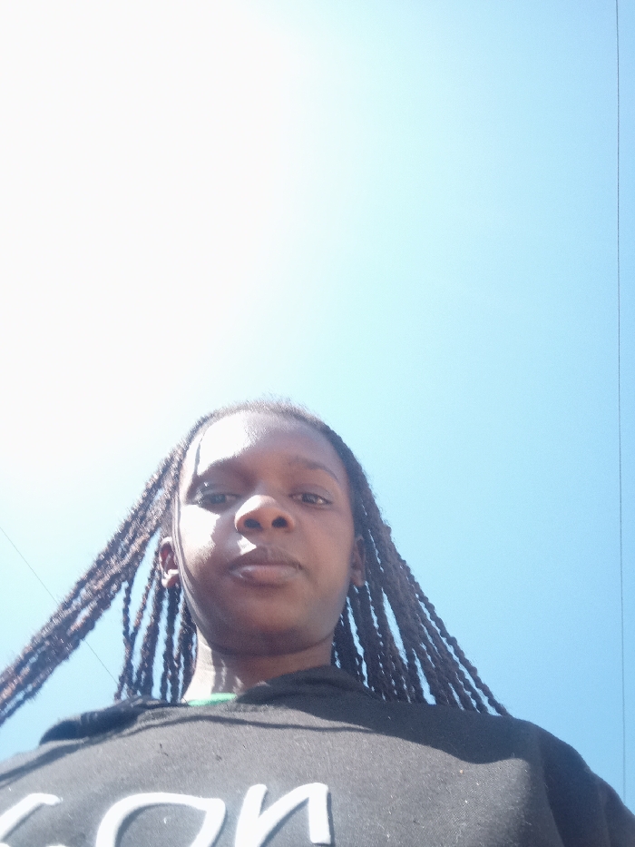 This image, captured in Mahiakalo ward, Kenya, depicts a single individual, appearing to be a young person with dark skin, positioned in a low-angle shot and looking directly into the camera. The subject has numerous dark braids, which frame their face and extend downwards. They are wearing a dark hooded sweatshirt with partially visible light-colored lettering on the chest. A green garment is visible beneath the neckline of the sweatshirt. The background consists entirely of a clear, bright blue sky, with a thin, dark linear object, consistent with an overhead wire or cable, visible in the upper left and upper right portions of the frame. The scene is brightly illuminated by natural light.